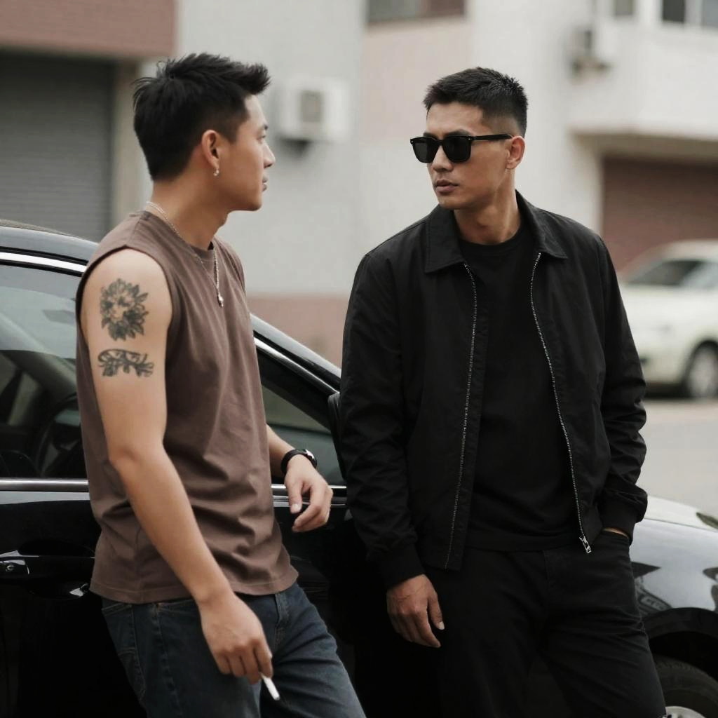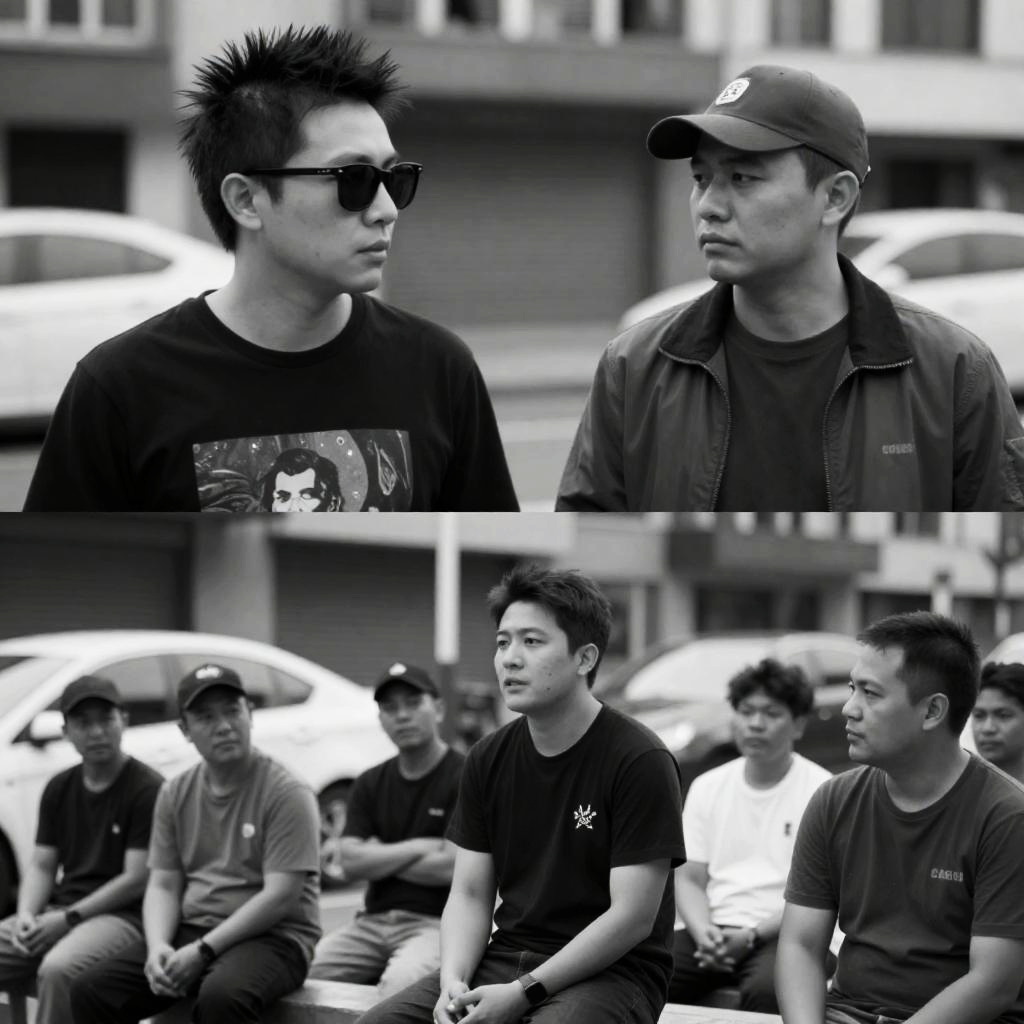 Black and white photograph. Two men in upper panel, one with spiky hair and sunglasses, other in cap and jacket. Lower panel, group of men sitting, one speaking, others listening. Urban setting, cars, buildings in background.