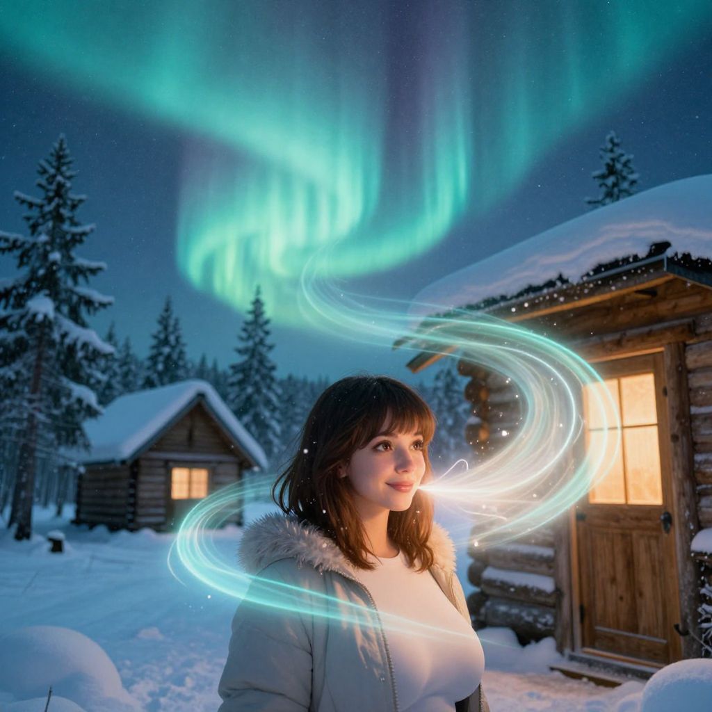 A mystical northern twilight scene where aurora borealis spirits take the form of glowing, flowing neon gradients that spiral around a cabin nestled in the snow-covered forests—soft, radiant lights pulse like breath, illuminating a woman with warm brown eyes and a kind smile standing in front of a wooden door.. The woman has big tits and cute face