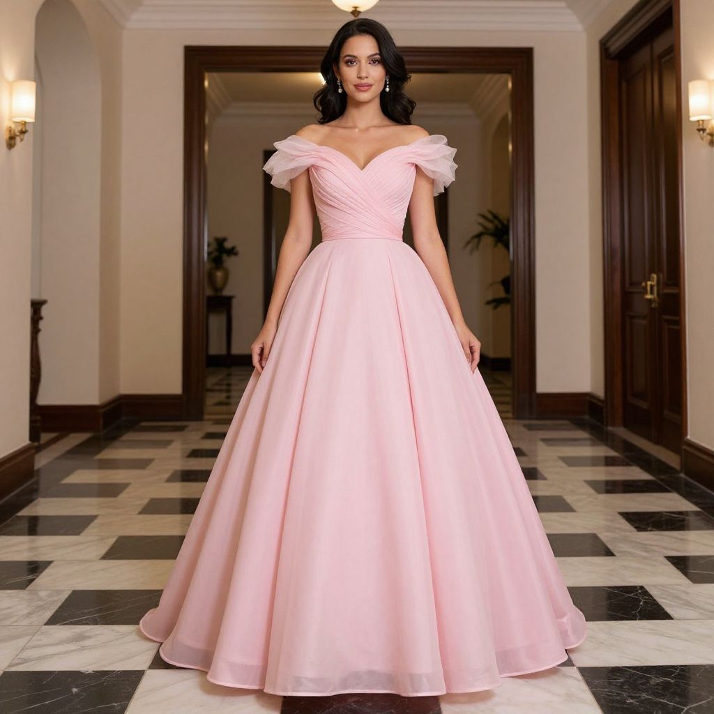 Photograph of a woman with medium-dark skin and dark wavy hair, wearing an off-the-shoulder, pastel pink ball gown with a fitted bodice and full skirt. The gown has delicate ruffled sleeves and a subtle sweetheart neckline. She stands in a grand hallway with black and white checkered marble floors, beige walls, and wooden doors. Soft, warm lighting from wall sconces illuminates the scene, and a potted plant is visible in the background. The woman's poised stance and elegant dress exude sophistication.