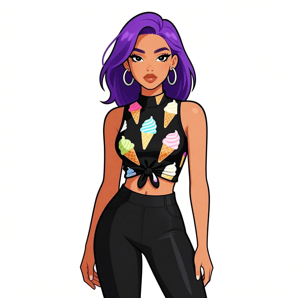 Woman with pretty face and pretty hair. Woman, contemporary street style, high neck sleeveless crop top in black with colorful ice cream cone print, tied at the waist, paired with high-waisted black leggings in a glossy finish, silver hoop earrings, white background. --sref 1467