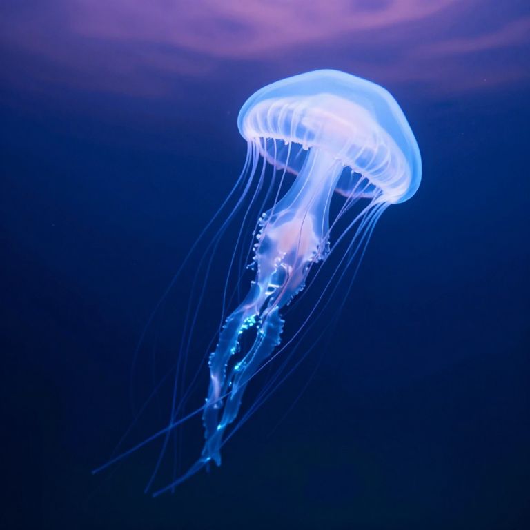 A luminous jellyfish of ethereal proportions floats gracefully through the depths of a twilight sea, its translucent body glowing with bioluminescent trails that weave and dissolve into the abyss below.