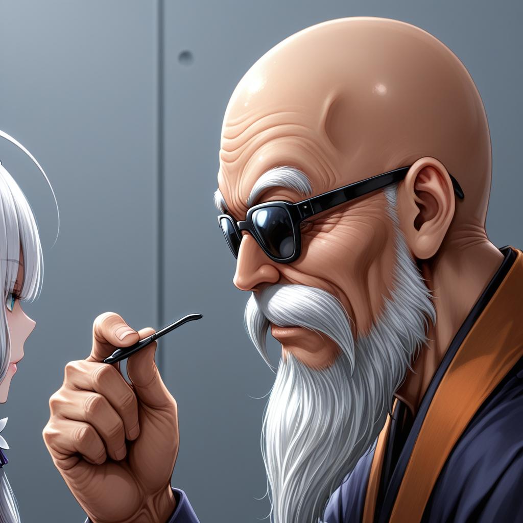 Muten roushi, dragon ball, 1boy, beard, mustache, white hair, sunglasses, bald, old man, by artist uni8, dark_illustrious