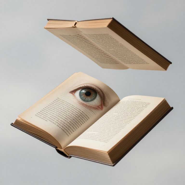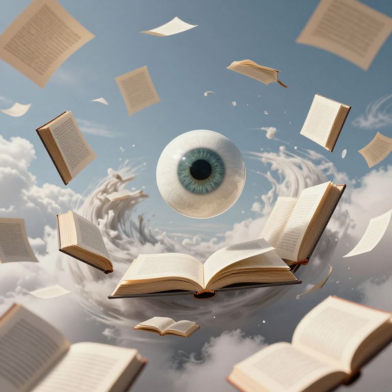 A solitary eye hovers serenely above a swirling vortex of open books, defying gravity as it floats amidst a sky of paper, where words and clouds intertwine in a mesmerizing dance of knowledge and imagination.