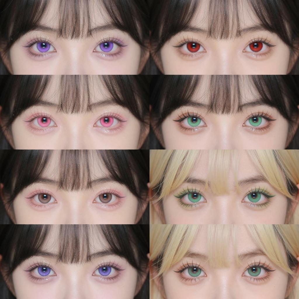 Photograph collage of eight close-up human eyes, diverse colors and styles. Top row: purple, red, and brown eyes. Middle row: pink, blue, and green eyes. Bottom row: multicolored, blue, and green eyes with varied makeup styles. Hair colors: black, blonde, green. Eye makeup: glitter, mascara, eyeliner. Facial expressions: neutral. Hair: straight, bangs, styled. Backgrounds: white, floral, indistinct. Grid layout, two columns, three rows.