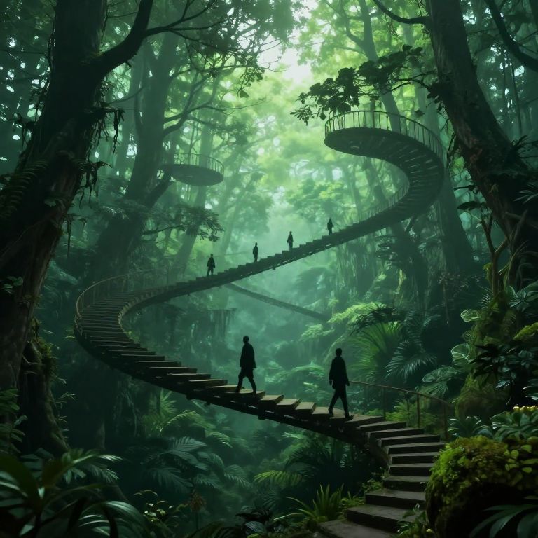 Digital artwork of a lush, dense jungle with a winding, spiral staircase leading up and down, silhouetted figures walking along it, bathed