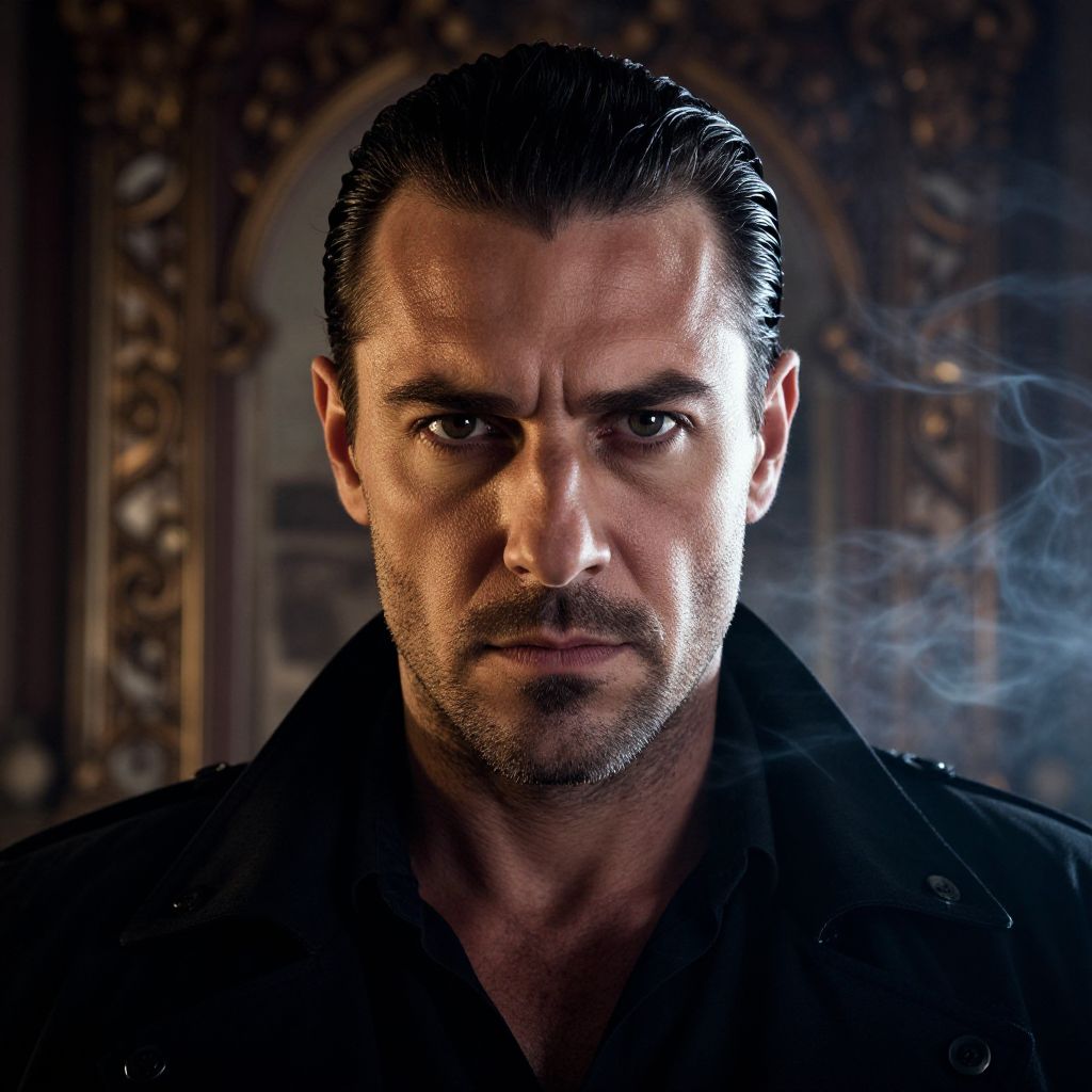 Sardinia mafia boss portrait, rugged man with sharp eyes and slicked-back hair, ornate Mediterranean backdrop, smoky, noir aesthetics, chiaroscuro lighting