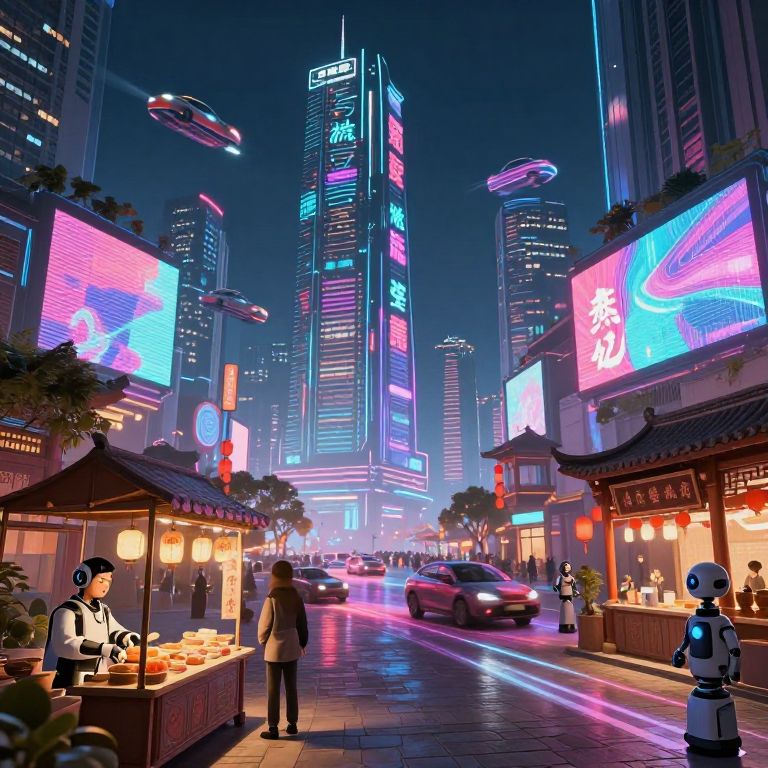 Futuristic Chinese city center illuminated by colorful holograms and giant LED screens showing Chinese calligraphy, flying cars zooming past, traditional street food vendors with robotic assistants, mix of old and new cultural elements creating a harmonious urban landscape