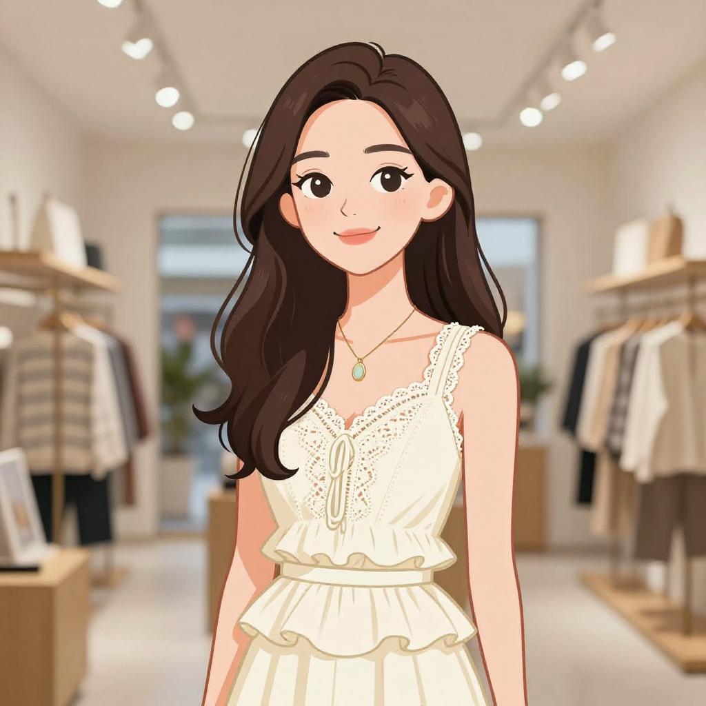 Digital anime-style drawing of a cheerful young woman with long brown hair, wearing a white ruffled blouse, black skirt with floral embroidery, black bow,