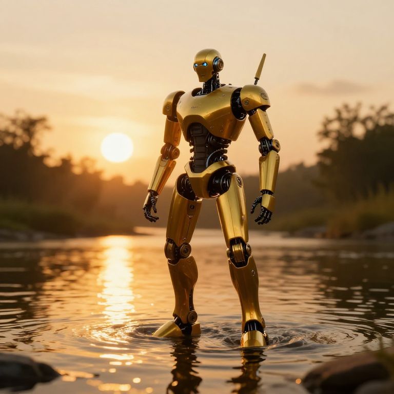 Golden robot standing in shallow water during sunset, with a serene, reflective river and tree silhouettes in the background.