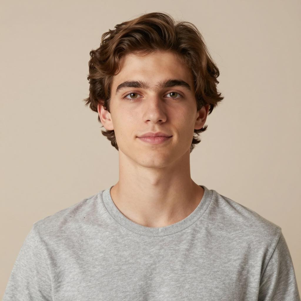 Photorealistic portrait of a young Caucasian male wearing a light blue button-up dress shirt, posing against a neutral gray background. The subject has short brown hair and a serious expression, captured in a studio setting with clear focus and symmetrical composition.