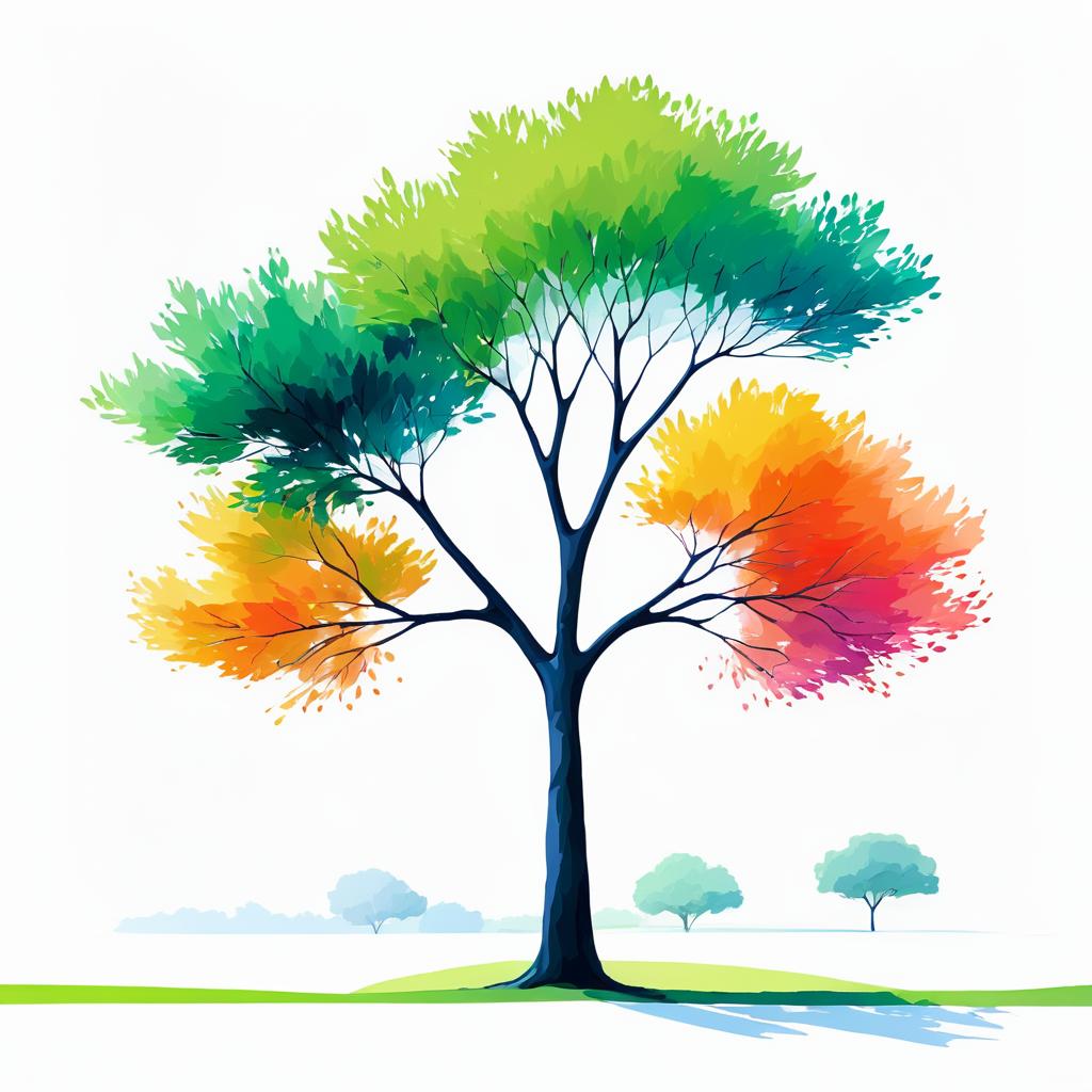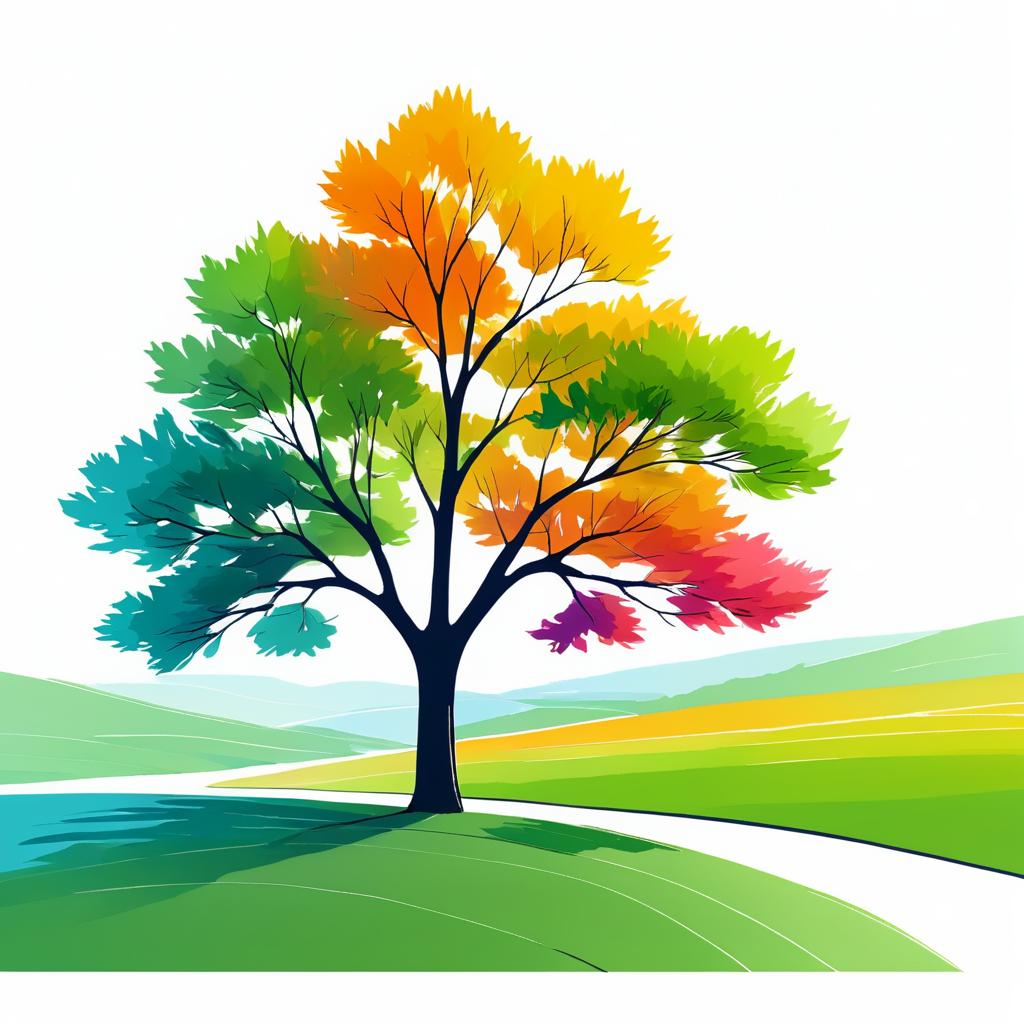 Landscape painting of a hand-drawn illustration of a tree, in a minimalistic style with vibrant colors on a white background, high quality.