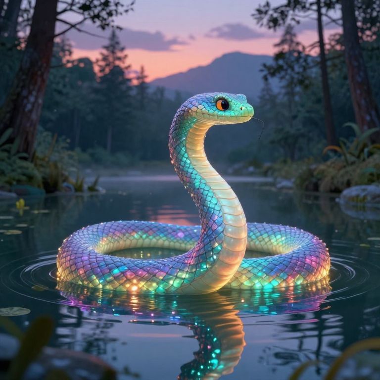 Photographic CGI of a glowing, iridescent snake with a long, slender body, coiled in a calm, reflective lake during twilight. The snake's scales shimmer in vibrant blues, purples, yellows, and greens, creating a bioluminescent effect. Its bright orange eyes stand out against the dark, forested background of tall trees and a pink-purple sunset sky. Ripples around the snake's body reflect the colorful glow, enhancing the magical atmosphere. The image combines realistic textures with fantasy elements, creating a surreal, enchanting scene.