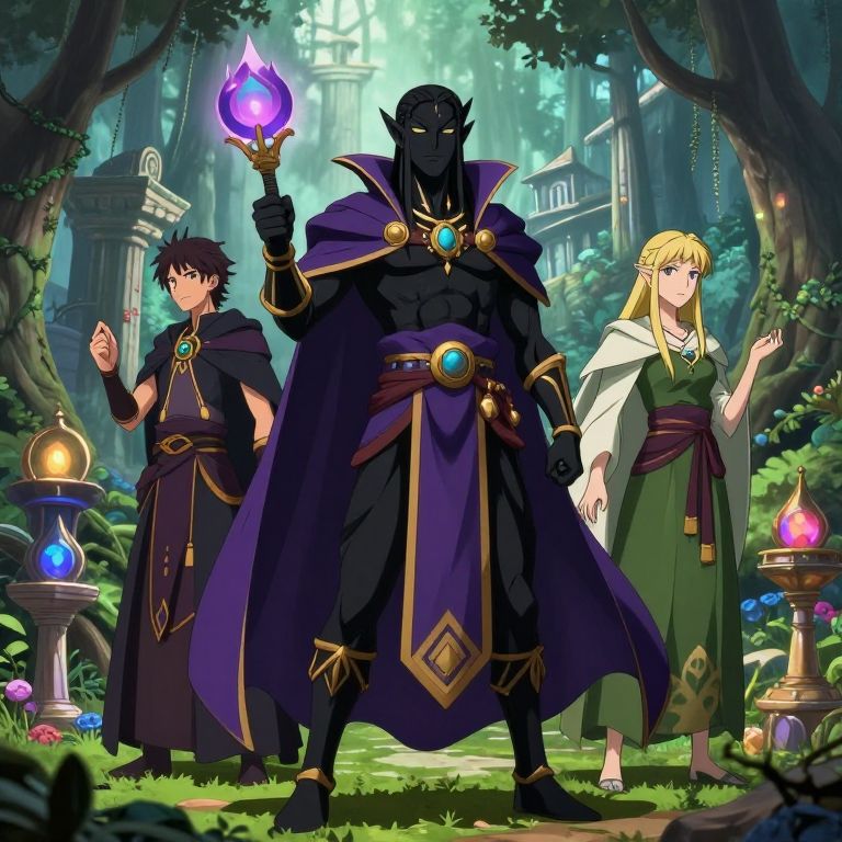 This digital anime-style illustration features three characters in a mystical forest. The central figure is a tall, muscular, black-skinned male with pointed ears, wearing a dark purple cloak with gold trim, a blue gem on his chest, and holding a glowing purple flame in his right hand. To his left, a shorter, dark-haired male in a similar purple robe holds a smaller, blue flame. On the right, a blonde female in a green dress with a white sleeveless top and a purple sash, holds a glowing pink flame. The background shows lush greenery, ancient stone structures, and glowing orbs on pedestals, creating a magical, enchanted atmosphere.