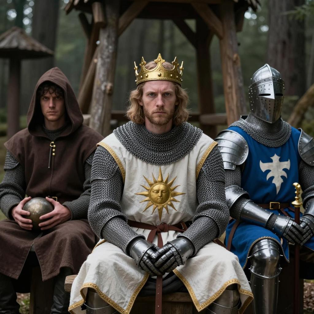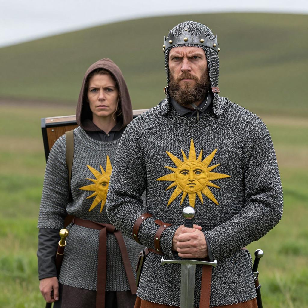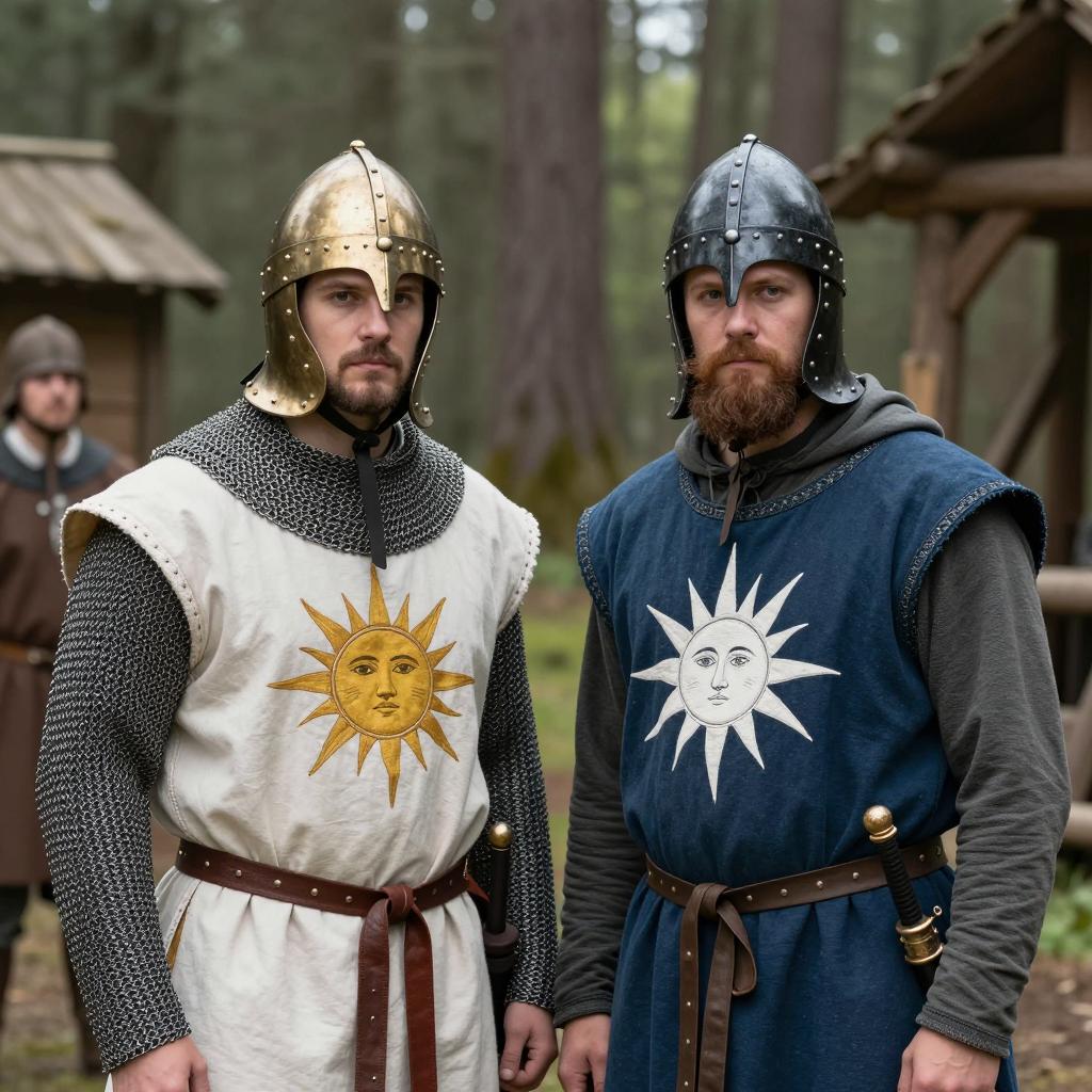 Two armored men in medieval attire stand in a forest. Left man in gold helmet, white shirt with sun emblem, chainmail; right man in black helmet, blue vest with white sunburst. Both have beards, serious expressions. Background includes trees and wooden structures. Third man in brown, partially visible on left.