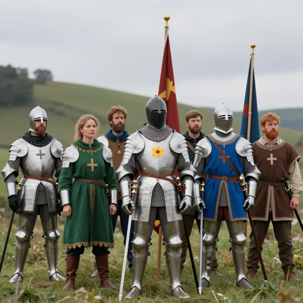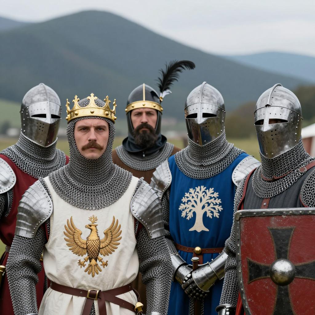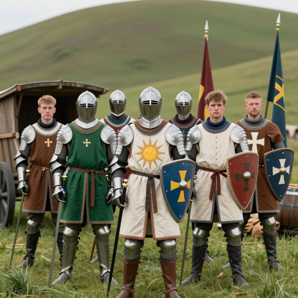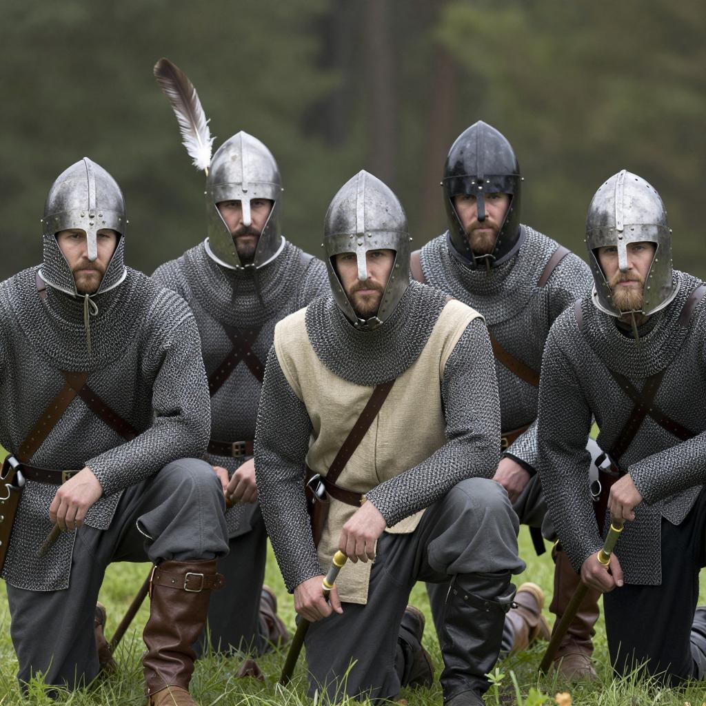 Two armored men in medieval attire stand in a forest. Left man in gold helmet, white shirt with sun emblem, chainmail; right man in black helmet, blue vest with white sunburst. Both have beards, serious expressions. Background includes trees and wooden structures. Third man in brown, partially visible on left.