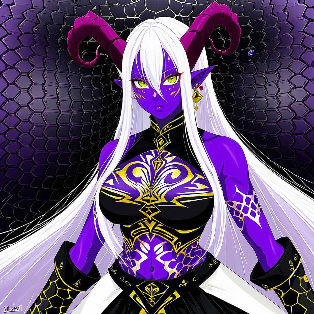 Alipheese fateburn xvi, mon-musu quest!, 1girl, purple skin, pointy ears, horns, yellow eyes, hair between eyes, eye tattoo, white hair, very long hair, long hair, hair tattoo, hair flower, large breasts, breast tattoo, navel, stomach tattoo, facial tattoo, elbow gloves, black gloves, black skirt, lamia, scales, single earring, by artist nicky w, anime