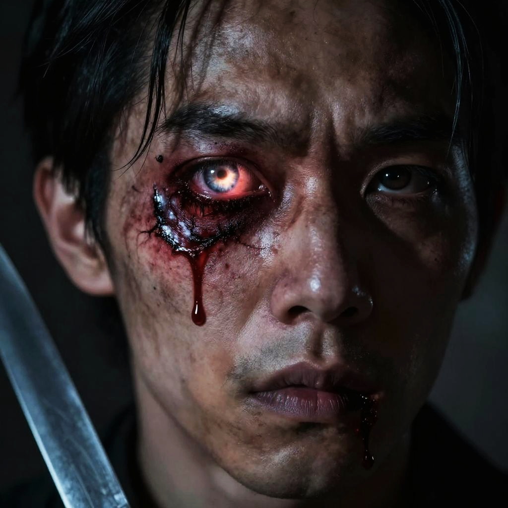 Stabbed in eye with knife, horror-themed portrait, intense expression, eerie glowing eye wound, dark shadows, detailed textures, grim, realistic gore effects, high contrast lighting