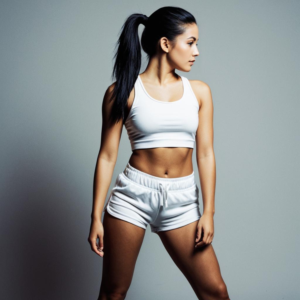 Dance outfit tweens,1girl, solo, realistic, brown hair, skirt, midriff, navel, ponytail, flat chest
