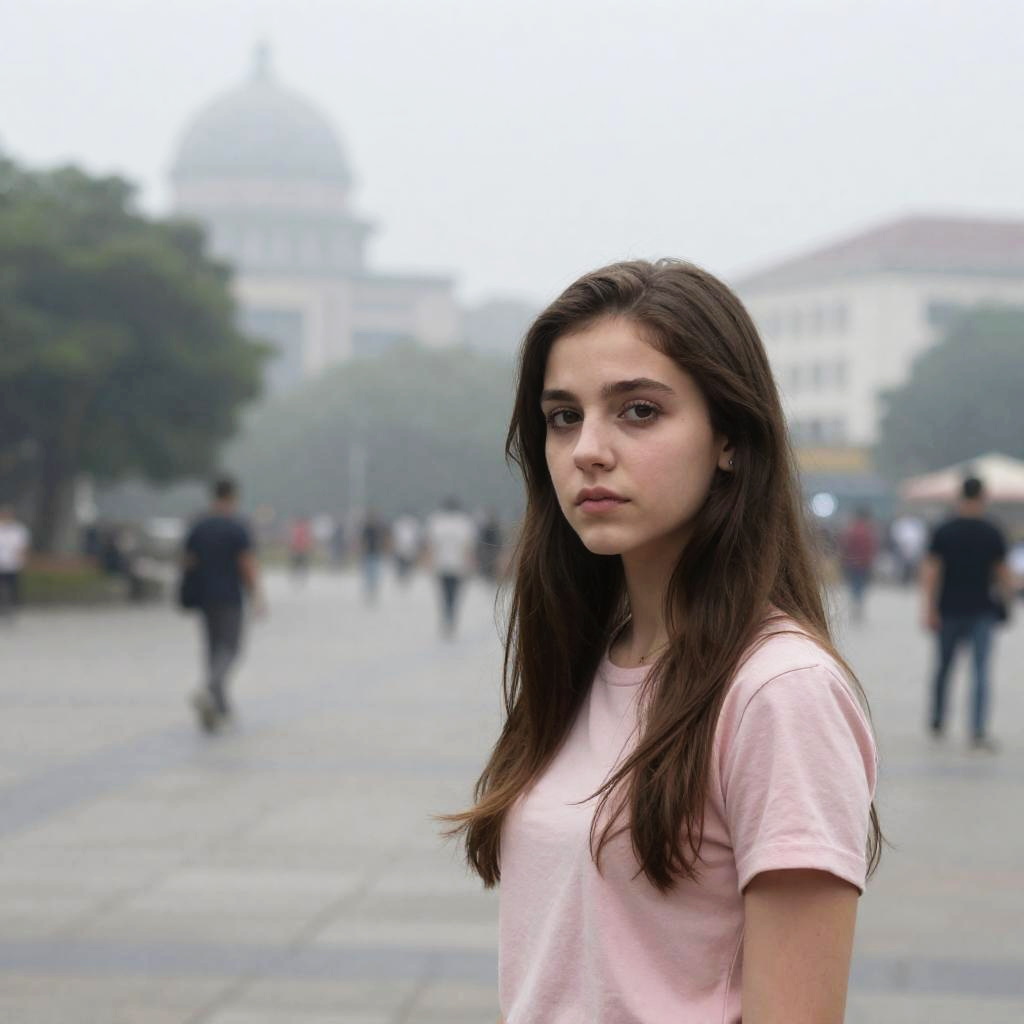 Young woman with long brown hair, wearing a pink shirt, stands in a foggy urban square. Blurred background shows people, trees, and domed structures. She has a serious expression, facing slightly to the left. Multiple people in the background.