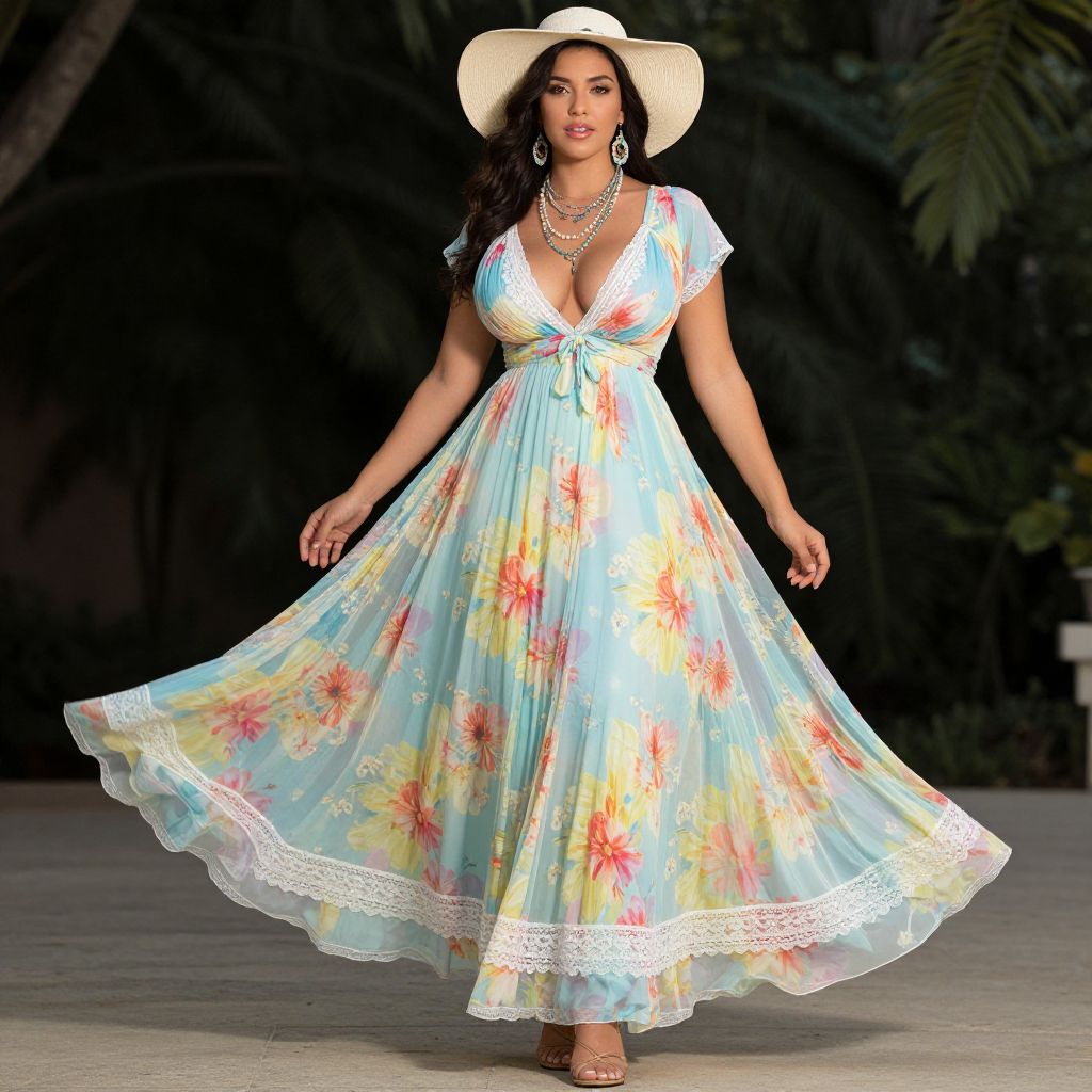 Full body shot, Busty woman, plunging neckline, vibrant floral print, flowing chiffon fabric, fitted bodice, flared skirt, delicate lace trim, short sleeves, cinched waist, soft pastel colors, lightweight and airy, ankle-length, strappy sandals, bohemian accessories, layered necklaces, oversized sunhat, natural makeup, sun-kissed glow Sexy. Pretty face and beаutiful eyes. Big breasts