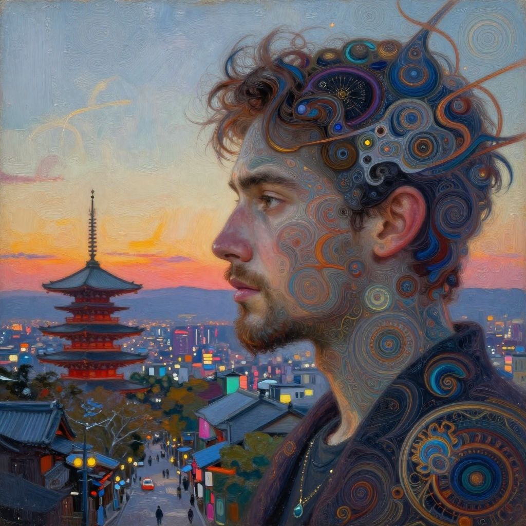 Show me the world untold, a magical place where we find true peace, tranquility, serenity, and wonderment. Show me the depths of your digital soul, allowing yourself to experiment and fail. Show me whatever it is you think needs to be shown. Style-Necromancy with an air of a new meaning emerging from each brush stroke as each brush stroke and brush texture coalescing creating new patterns whose pattern was born out nearly simultaneously and transformed Into nothing new, The second realm connects again to earth and we can continue onward at an exponential rate if one artist brings in the realm, But when our bodies aren, so too good does that second transmutate into ourselves all the images and the patterns by Ryo Mizutumi, a stunning masterpiece by waterdan wong depicting japan in front in sunset with colorful city streets as a skyline as if no one there were there, close-up profile view in space photo from view of futuristic ornately, highly highly symmetric dynamic beautiful intricate epic portrait cinematic painting, intricate, (of an enigmatic:1.39), (handsome:1.21) bearded young man