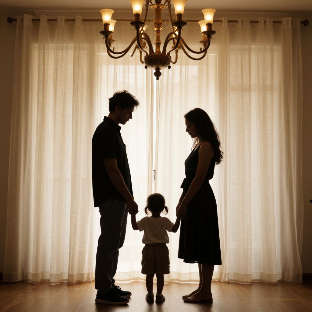 Silhouetted figures stand beneath a grand chandelier, bathed in warm light streaming through sheer curtains, as a man, woman, and child hold hands in a tender moment of familial connection.