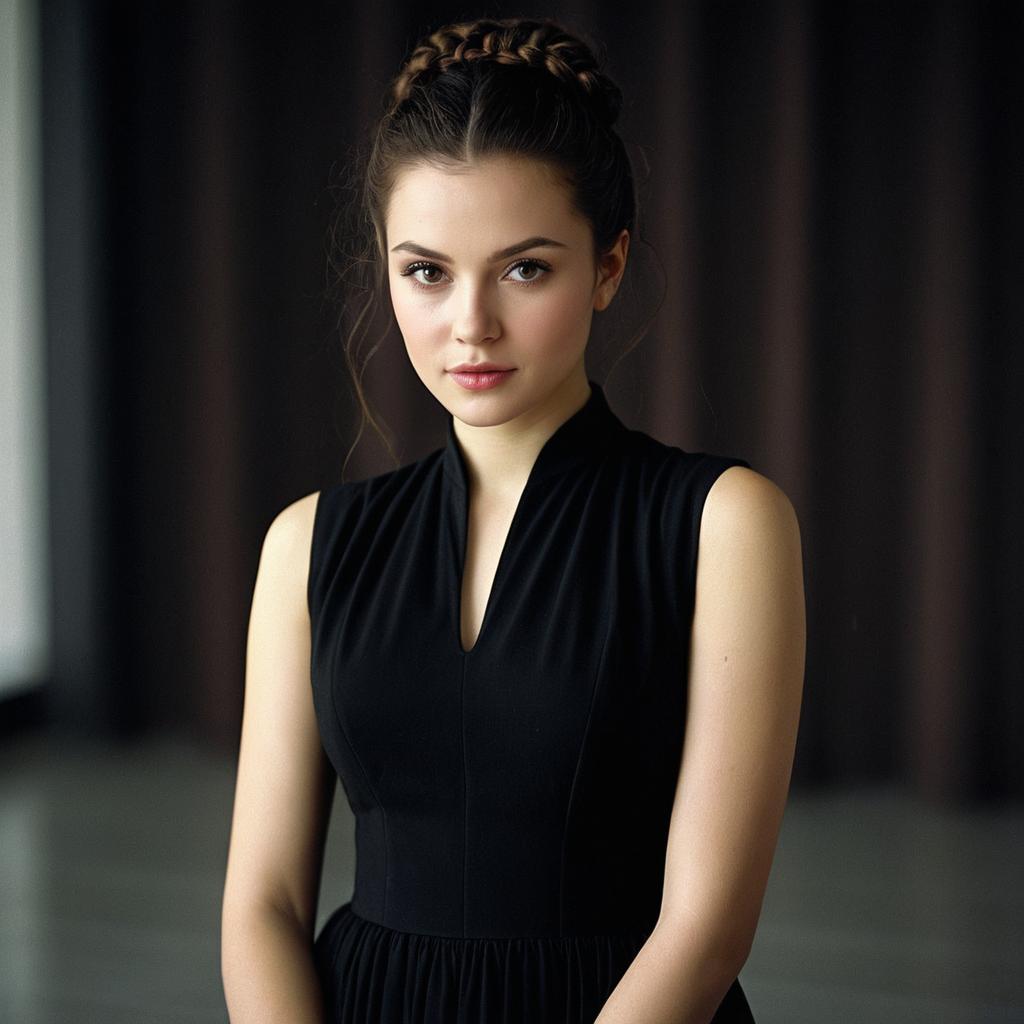 Padme black dress,1girl, solo, dress, black dress, realistic, blurry background, looking at viewer, brown hair, brown eyes, blurry, photorealistic