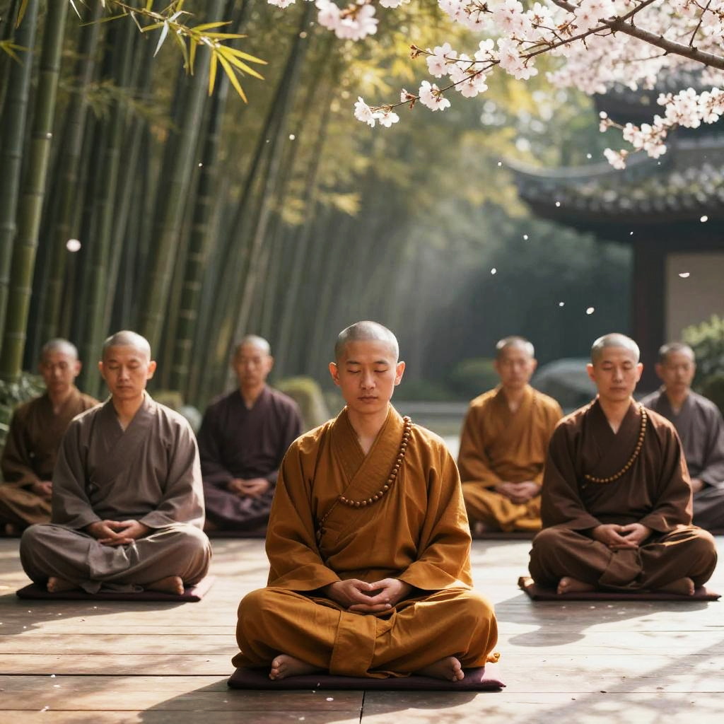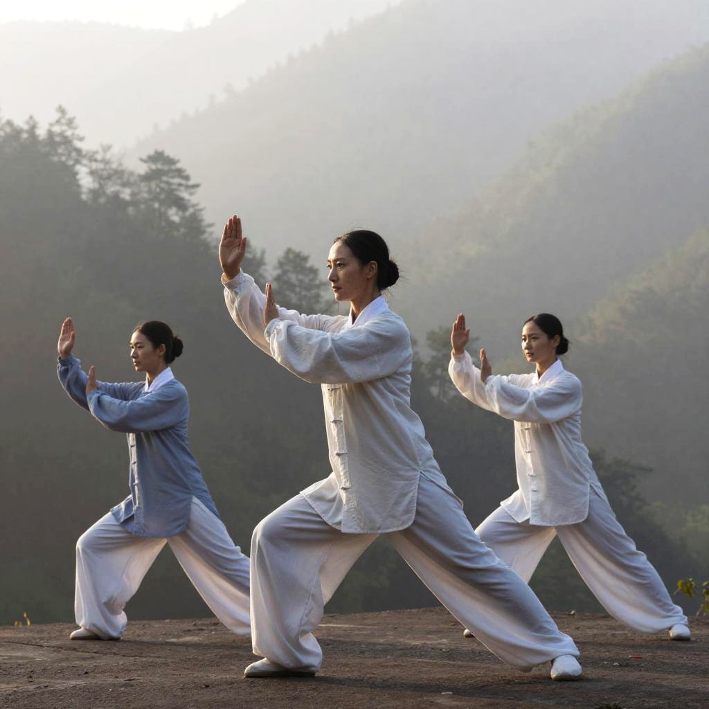 Beautiful Asian women practicing Tai Chi in a misty mountain landscape, flowing robes, graceful movements, calm atmosphere, early morning light filtering through trees