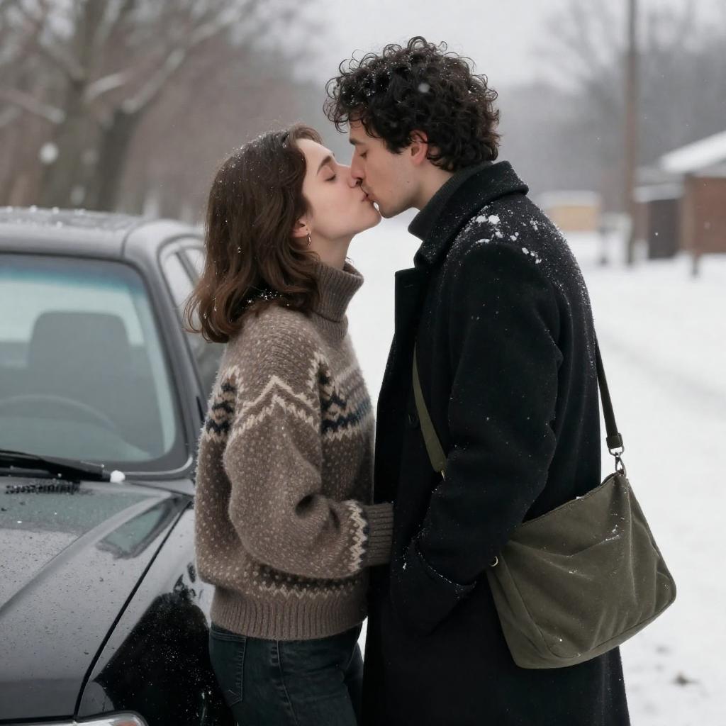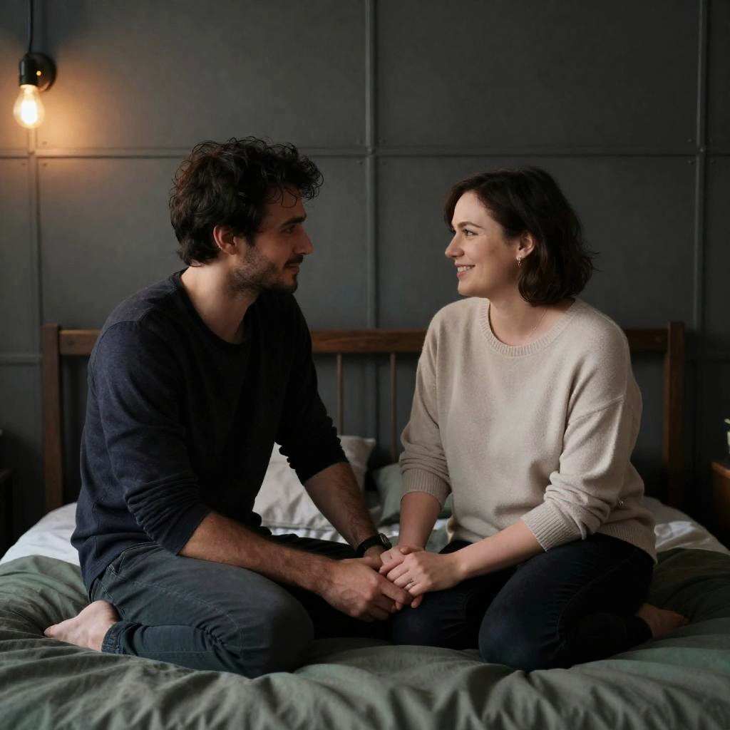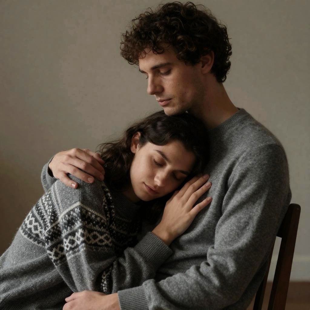 Two people in an intimate embrace. Woman with short brown hair in red hoodie, man with curly brown hair in black sweater, both smiling. Dimly lit room, computer on desk, white wall with pictures, closed door. Man's hands on woman's waist.