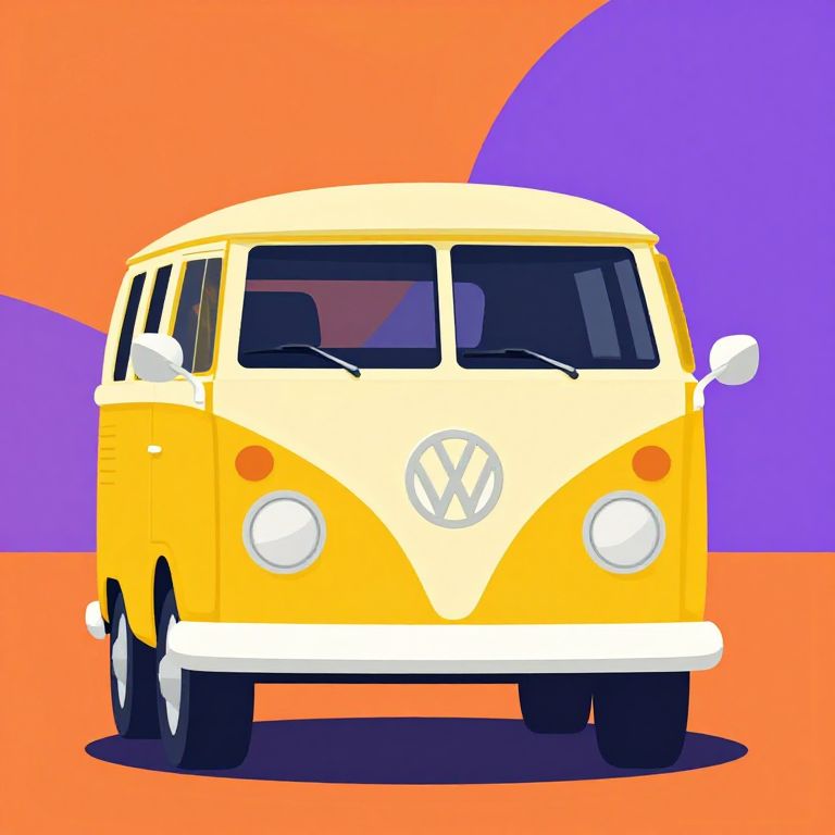 Digital illustration of a bright yellow vintage Volkswagen van with white accents, large circular headlights, and a prominent VW logo, set against a colorful orange and purple