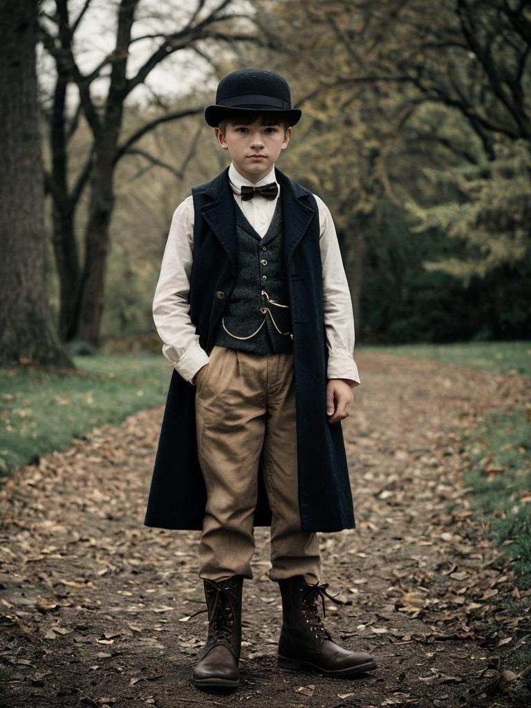 Full-body portrait of a young boy standing outdoors on a leaf-covered path, dressed in a vintage-style Thomas Shelby costume. He is wearing a black bowler hat, black trench coat, dark waistcoat with a chain accessory, white shirt, brown trousers, and dark lace-up boots. The boy has a serious expression and his left hand is in his pocket. The background features blurred trees and autumn foliage.