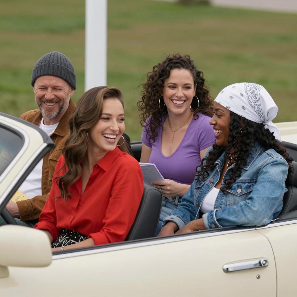 Four people in a beige convertible, three women and one man, laughing and chatting. Man in gray beanie and brown jacket, left. Woman in red shirt and black patterned skirt, left front. Woman in purple top and large hoop earrings, center. Woman in blue denim jacket and white bandana, right. All seated, casual clothing. Green grass and white pole in background. Man holding a book, woman in center holding papers.