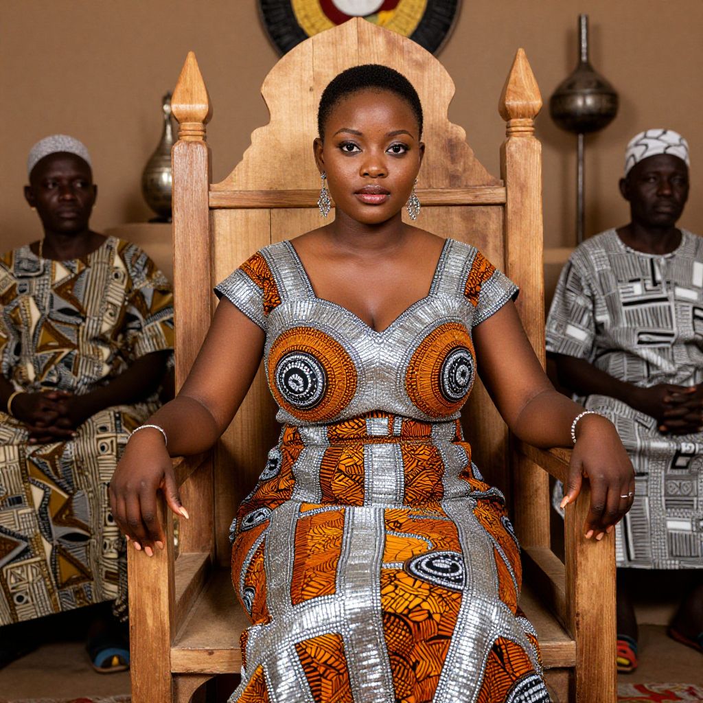 A stunning African dress, costume made of richly woven cotton and silver thread, worn by a poised African woman with soft features, deep brown skin, and a calm gaze, seated gracefully on a wooden throne in a ceremonial setting in Mali, surrounded by elders and traditional artifacts.. The woman has big tits and cute face