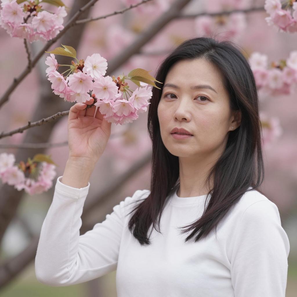 Photograph of an Asian woman with light skin. She wears a large white wide-brimmed hat, white rectangular sunglasses, a white blazer, a pearl necklace, and large pearl earrings. She holds a white feathered accessory in her right hand, smiling with her mouth open. She has black-painted nails. Background includes a blurred stone structure and greenery.