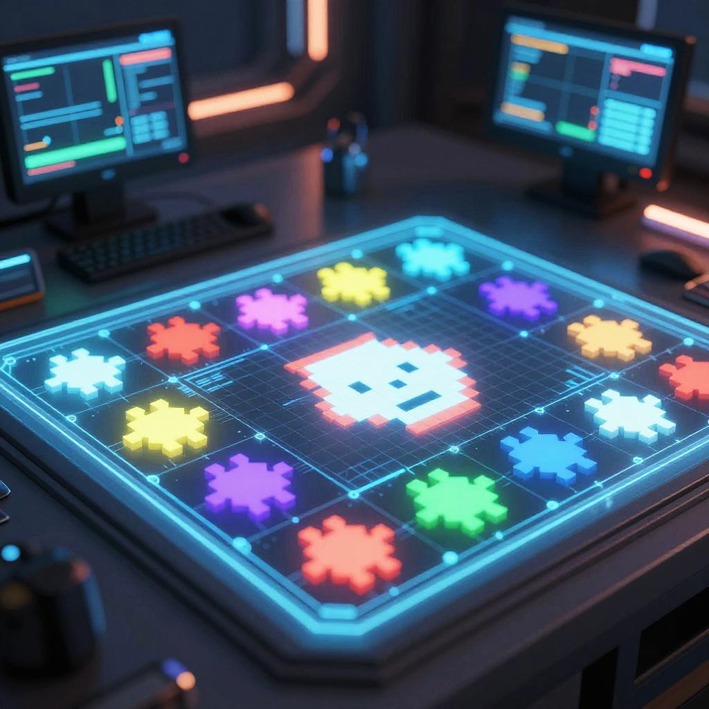 Close-up of an AI game sprite generator interface, glowing holographic grid with pixel sprites being formed in real-time, multicolor pixels floating and assembling, sci-fi control room filled with digital displays, emphasizing pixel art creativity enhanced by AI, cybernetic colors and lighting