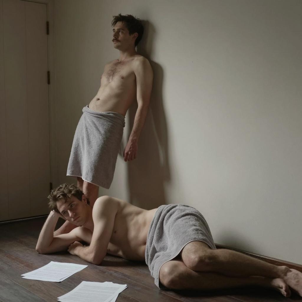 Two men in a dimly lit room. One with short brown hair and a mustache, shirt off, gray towel around waist, leaning against wall. Second man, also with brown hair, shirtless, gray towel around waist, lying on floor, head on arm. Shadows on wall. Floor has scattered papers. Background includes a brown, partially visible door with vertical lines.