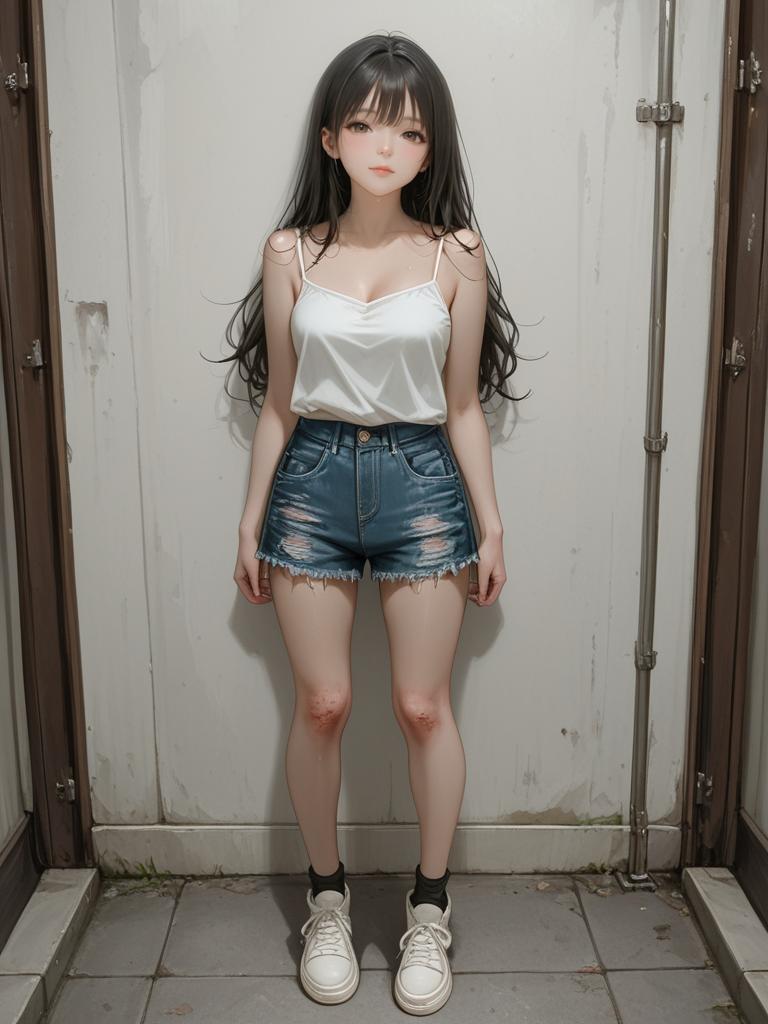 Photograph of an East Asian woman standing in a narrow, dimly-lit hallway with white, slightly worn doors behind her. She has long, straight black hair with bangs, fair skin, and a slender physique. She wears a white, spaghetti-strap camisole that reveals a hint of cleavage, paired with high-waisted, frayed denim shorts that show her thighs. She has on white sneakers with black socks. Her expression is neutral, and she stands with her arms relaxed by her sides. The floor is tiled, and the walls are grey. The lighting is even, highlighting her figure against the plain background.