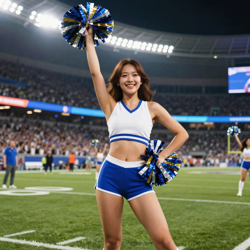 A woman cheerleader in a blue and white athletic outfit performs on a football field, holding pom-poms and smiling confidently. The scene captures the energetic atmosphere of a stadium event with bright lights and a cheering crowd in the background.