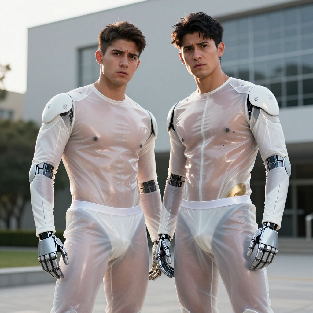 Two strong slender 24-year-old latino bodybuilder males, with a short curtains haircut, detailed face, confused expressions, wearing a skin tight white transparent latex cybernetic suits with light-gray, silver and gold latex details, wearing skin tight transparent white latex jockstraps over his transparent latex suits, standing at attention posture, on a modern university, looking to the camera, Cinematic, Photoshoot, Shot on 25mm lens, Depth of Field, Tilt Blur, Shutter Speed 1/1000, F/22, White Balance, 32k, Super-Resolution, Pro Photo RGB, Half rear Lighting, Backlight, Dramatic Lighting, Incandescent, Soft Lighting, Volumetric, Conte-Jour, Global Illumination, Screen Space Global Illumination, Scattering, Shadows, Rough, Shimmering, Lumen Reflections, Screen Space Reflections, Diffraction Grading, Chromatic Aberration, GB Displacement, Scan Lines, Ambient Occlusion, Anti-Aliasing, FKAA, TXAA, RTX, SSAO, OpenGL-Shader s, Post Processing, Post-Production, Cell Shading, Tone Mapping, CGI, VFX, SFX, insanely detailed and intricate, hyper maximalist, elegant, dynamic pose, photography, volumetric, ultra-detailed, intricate details, super detailed, ambient