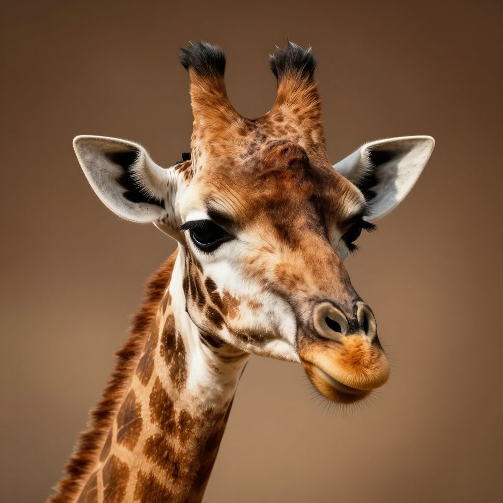 A detailed close-up portrait of a giraffe with highlighted facial features, showcasing its unique patterns and textures. The image focuses on the giraffe's eyes, nose, and ossicones against a gradient brown background.