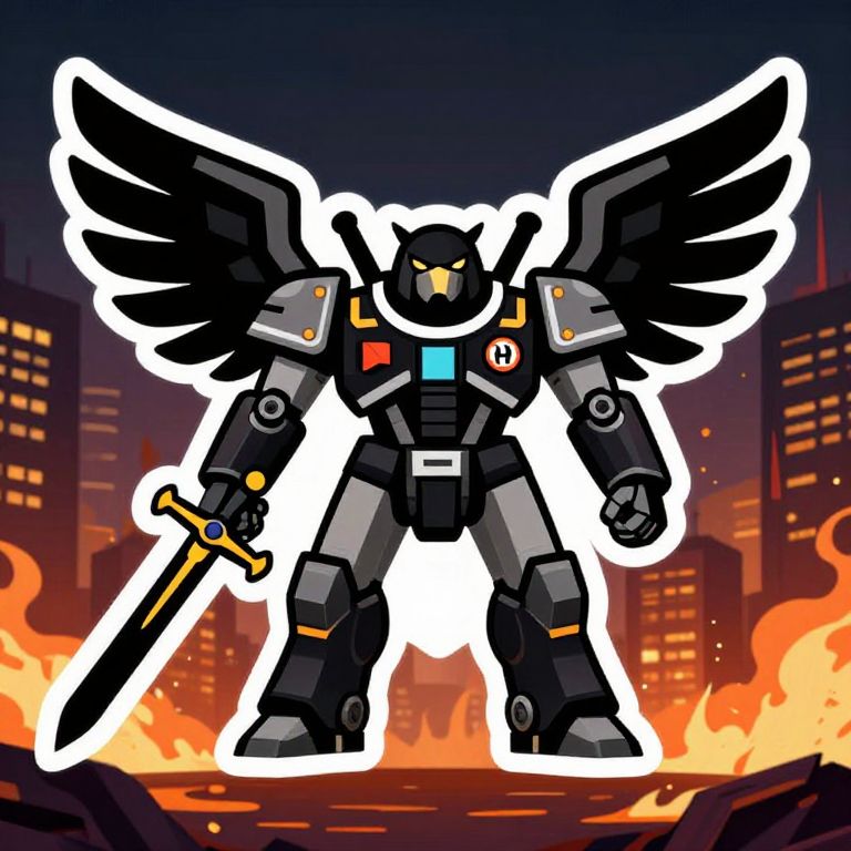 Orc NFL style logo for football competition, minimalist, one mech has giant hawk wings and a sword, close up, battletech, burning city background,