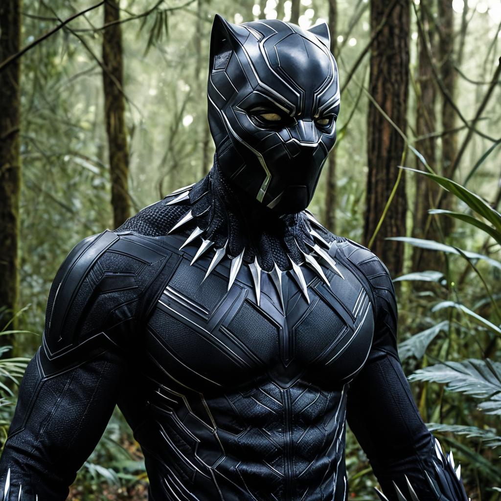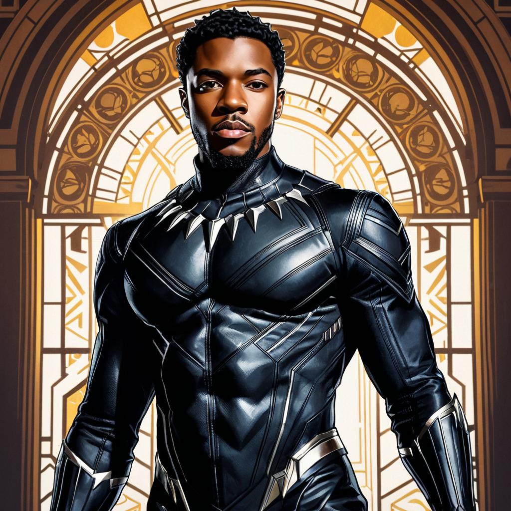 Digital painting of a Black Panther inspired male figure wearing a detailed black vibranium suit with silver accents and claw necklace. The portrait features a muscular dark-skinned man standing confidently against an ornate golden and white stained glass window background. The image is a vibrant, sharp-focused, full-body concept art illustration with intricate design elements.