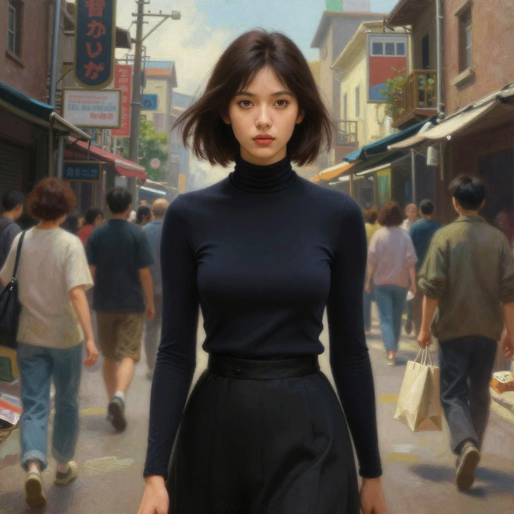 Photo of extremely sexy (zend4y4-160:0.99), a woman as a sexy student, ((closeup portrait:1.2)), modelshoot style, (extremely detailed CG unity 8k wallpaper), photo of the most beautiful artwork in the world, professional majestic oil painting by Ed Blinkey, Atey Ghailan, Studio Ghibli, by Jeremy Mann, Greg Manchess, Antonio Moro, trending on ArtStation, trending on CGSociety, Intricate, High Detail, Sharp focus, dramatic, photorealistic painting art by midjourney and greg rutkowski, (tight turtleneck top:1.2), (long skirt:1.1), ((crowded slums street)), (looking at viewer:1.2), (detailed pupils:1.3), (holding a shopping bag:1.1)