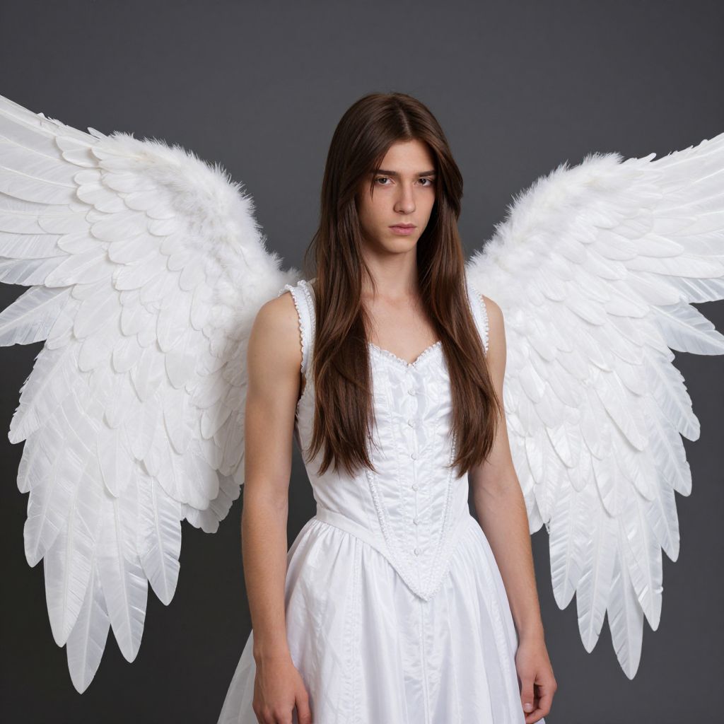 Juliet costume wings, solo, wings, 1boy, male focus, long hair, brown hair, realistic, otoko no ko, dress, angel wings