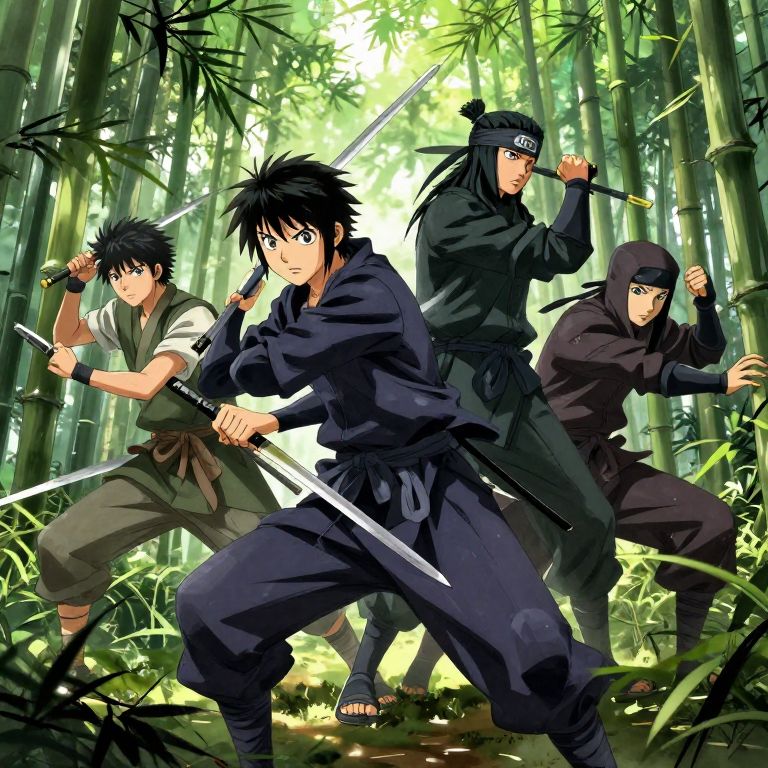Anime ninja art with a group of ninjas in a bamboo forest, each with unique weapons and distinct styles, vibrant green foliage with scattered sunlight, action-packed composition, ink brush style mixed with modern digital textures, dramatic lighting