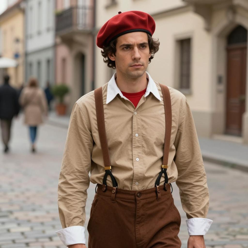 Royal tenenbaum costume, photorealistic, young man, brown jacket with beige lining, red tie, orange beret, round glasses, mustache, curly brown hair, standing, outdoor, daytime, blurred background, group of people, historical, 1960s fashion, serious expression, medium shot, warm colors, mid-century attire
