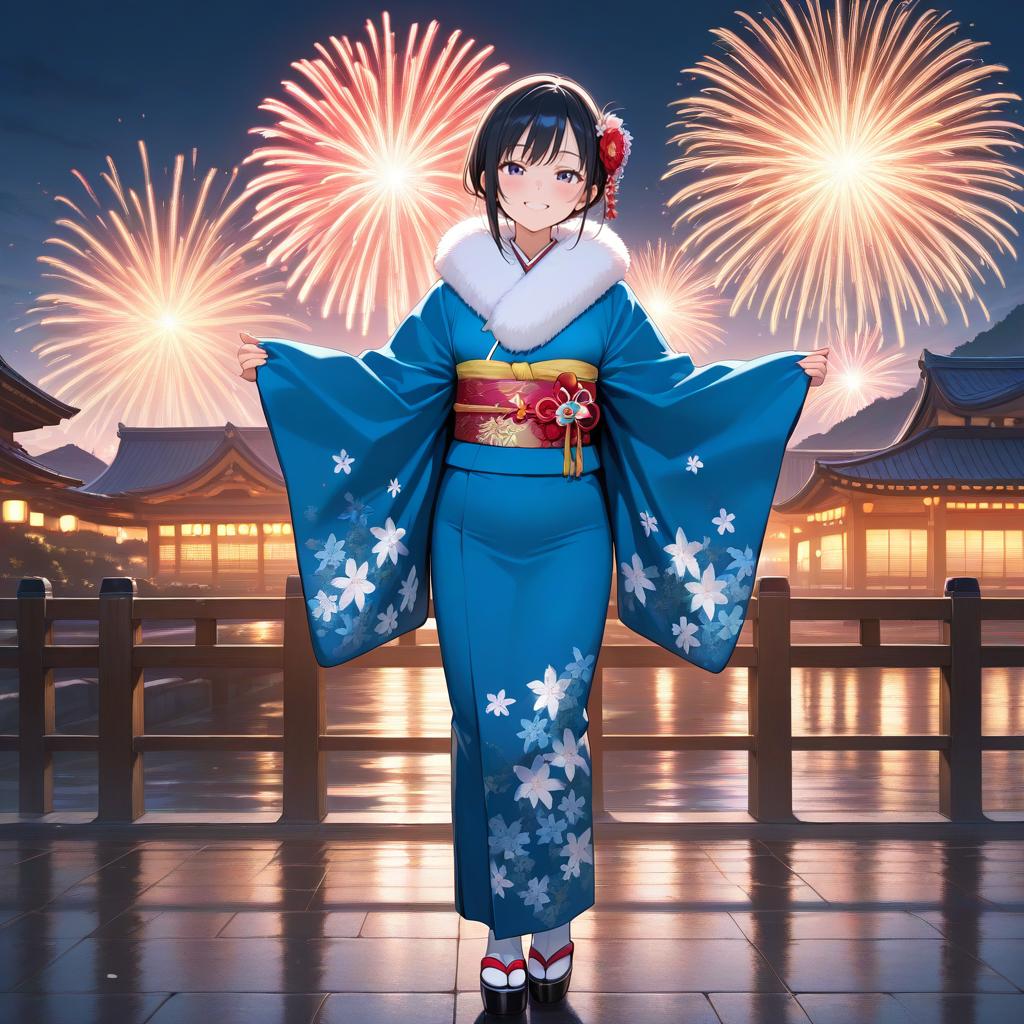 2d, masterpiece, best quality, anime, highly detailed, full body, 1girl, solo, gura_kimono, blue kimono, fur collar, smile, sharp teeth, standing, japanese town, new years, fireworks