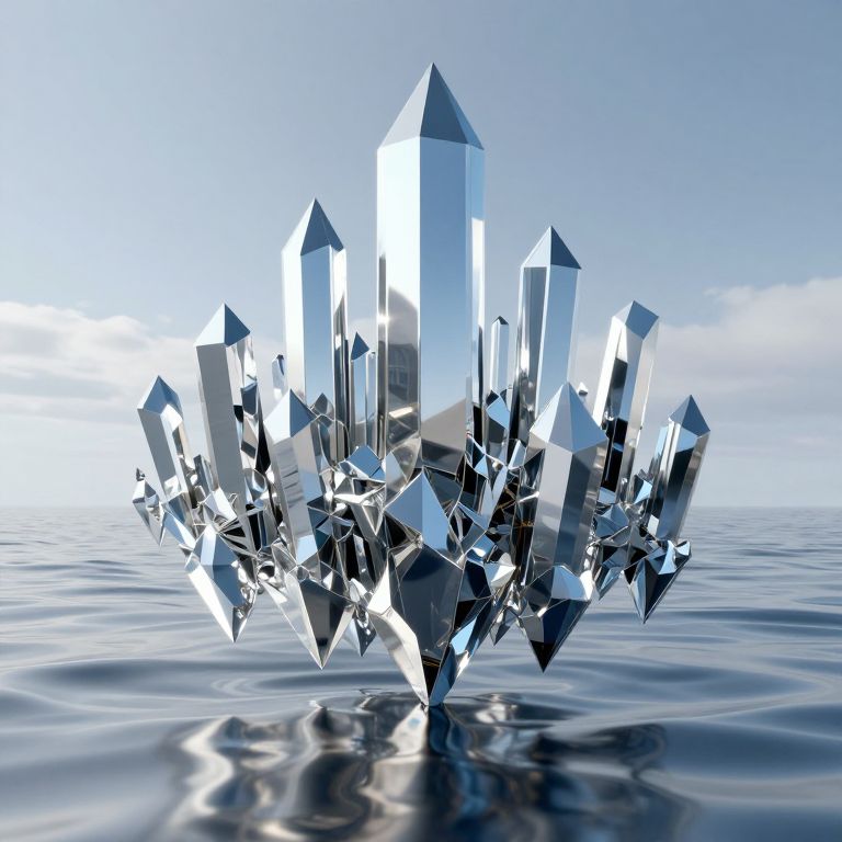 A city of mirrored crystals floats atop a sea of mercury, reflecting alternate dimensions into impossible geometries and optical paradoxes.