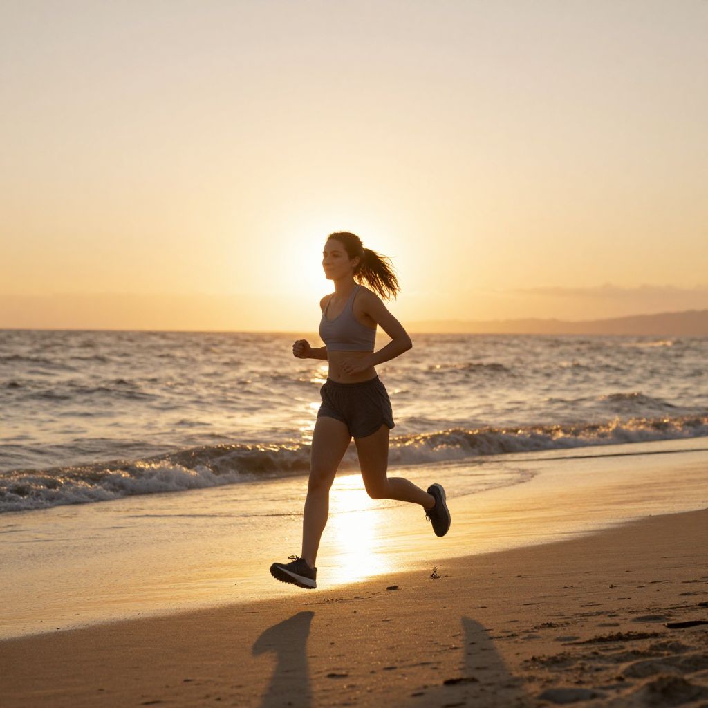 Photograph of a woman running on a beach at sunset, silhouetted against the glowing sun, wearing a sports bra and shorts, with waves