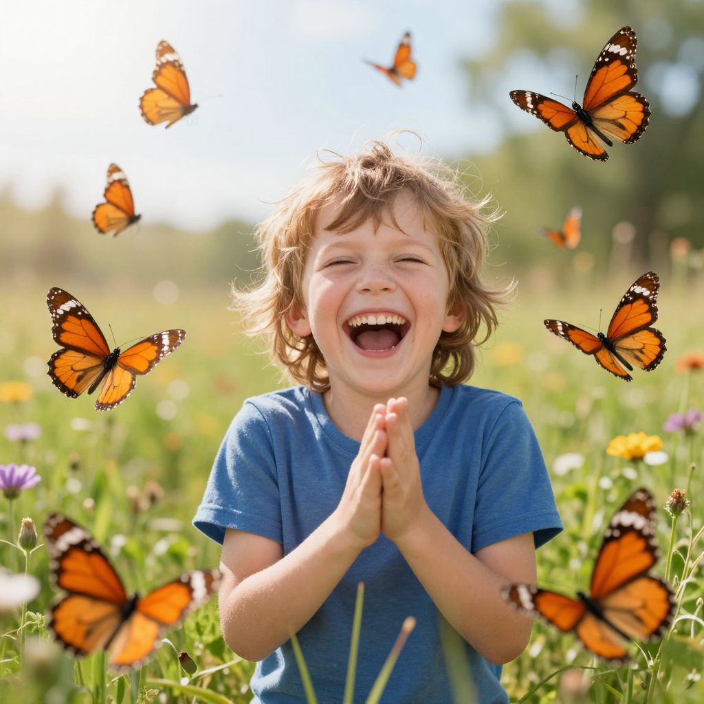 A child stands in a field of golden grass, arms outstretched toward a sky alive with fluttering butterflies, embodying the boundless wonder of innocence and the ephemeral beauty of dreams taking flight.